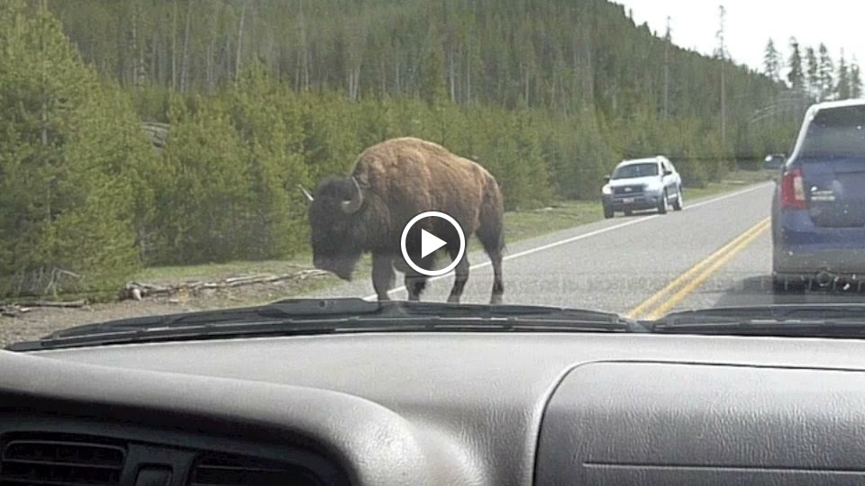 Hike up Bunsen Peak: On the drive up we hit some buffalo traffic and passed a deep waterfall and ravine. The trailhead was an old road and a cross country ski trail. After hiking a couple of minutes on this our trail turned left and turned into a one track hiking trail through dense pine and burned away areas. This meandered along the ravine and waterfall that we passed on the drive up and came to a large field of grass and shrub. We crossed the field and started up switchbacks that slowly worked their way to the other side of the mountain. There was still snow on top so we didn't go all the way to the summit. On the way back down the switchbacks we spotted a mother Elk down in the field acting a little bizarre. We were told that they hide their babies and then leave them to distract predators. But when she sees something getting close to her baby she will attack. We were worried that our trail might go near her baby so we were trying to spot the baby when we saw something coming out of the woods. A black bear came out of the woods on the grassy field below us. We watched it meander along the edge of the woods away from our trail until it moved out of sight and hiked back down to our car to watch the sun set over the distant mountains.